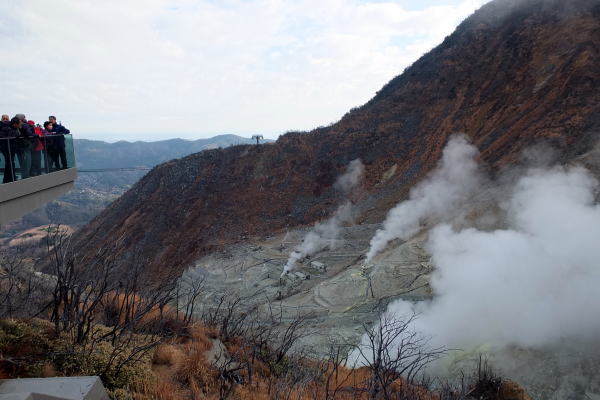箱根高原ホテル 08:20→ 08:30 桃源台 09:00→(ロープウェイ)→ 09:20 大涌谷(観光) 09:35 →(代行バス)→ 早雲山